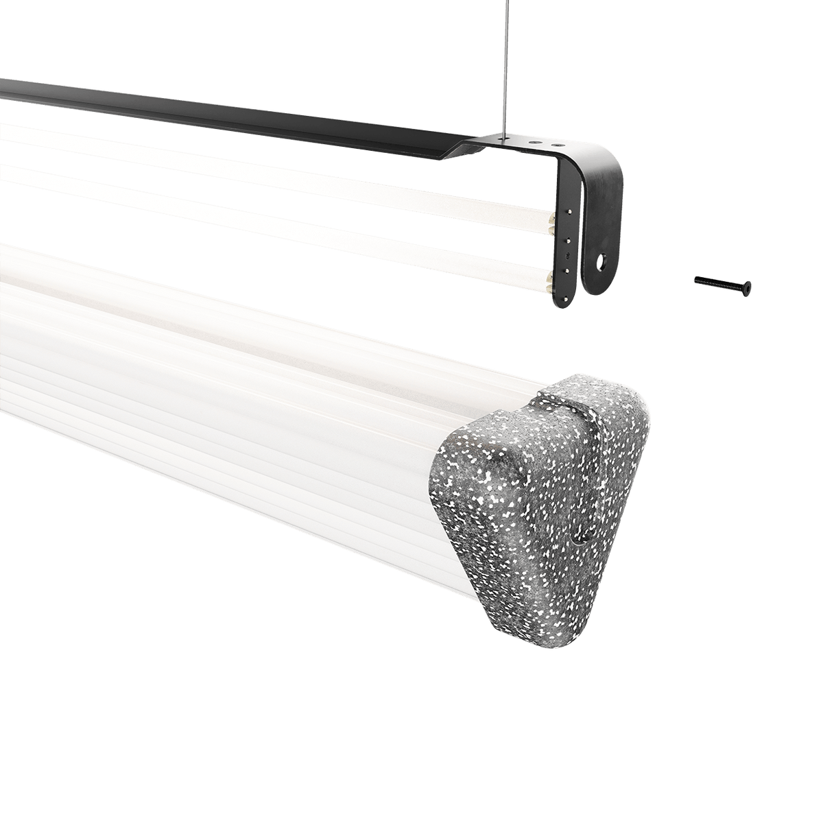 La suspension se règle facilement et la fixation au mur se fait par des trous oblongs qui permettent un alignement et un serrage vraiment simple. Ouvrir la lampe pour accéder aux tubes leds se fait en un quart de tour.